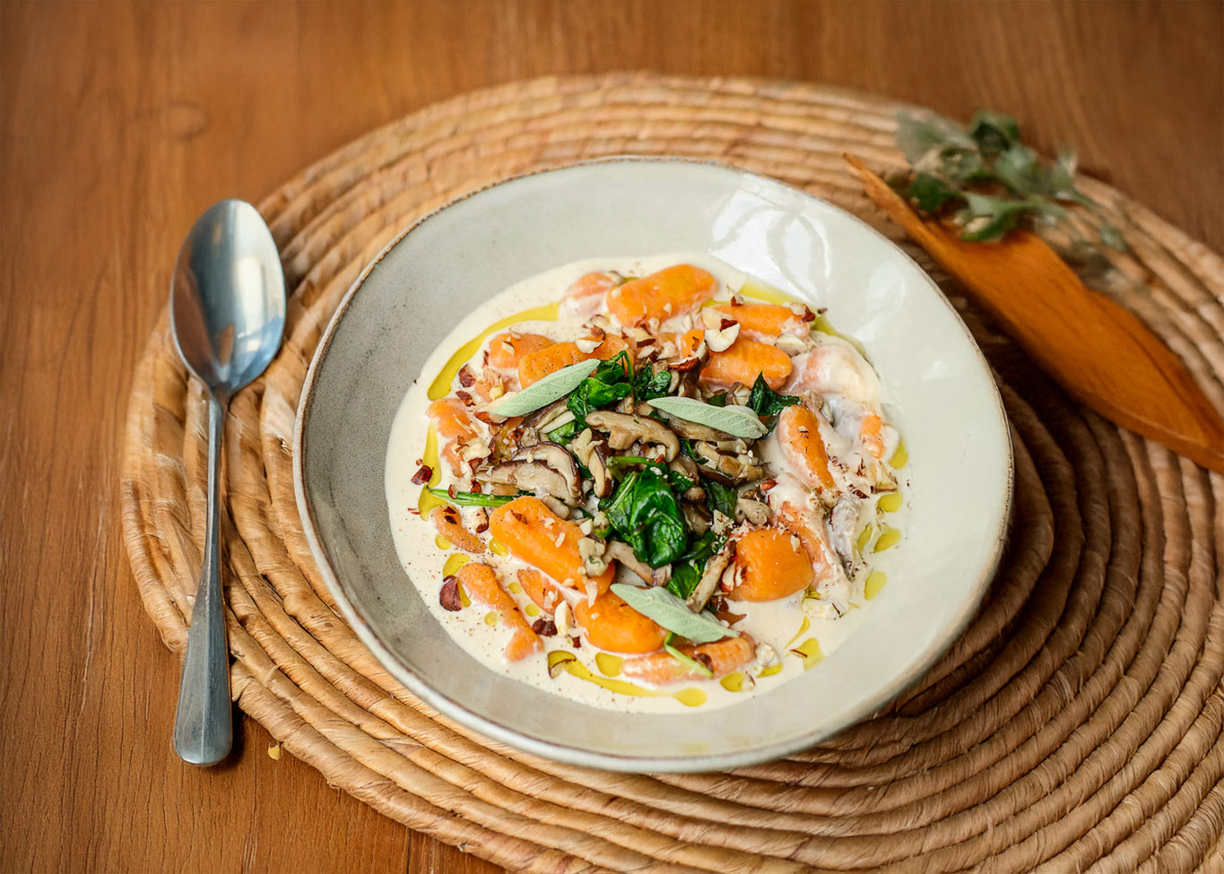 Gnocchi de patate douce, sauce crémeuse, champignons et épinards