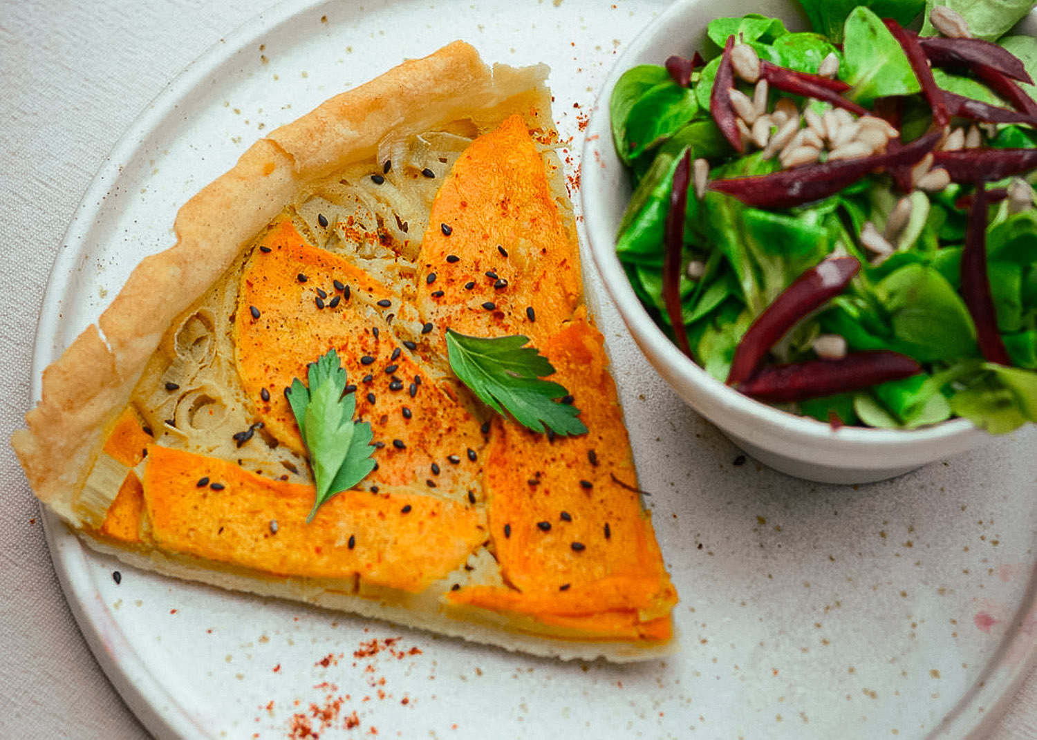 Tarte d’automne au butternut et poireaux, salade de rampon